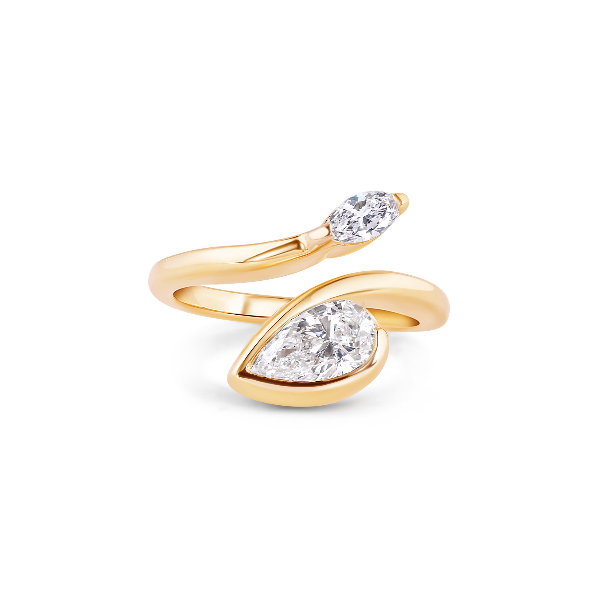 The Camille ring, a modern twist on timeless elegance, this bypass ring features two natural diamonds in pear and marquise cuts, set in polished yellow gold. The open design creates fluid movement and balance, while the brilliance of the lab diamonds brings striking sparkle from every angle. Bold yet refined, it’s a statement piece designed for everyday sophistication or special occasions.