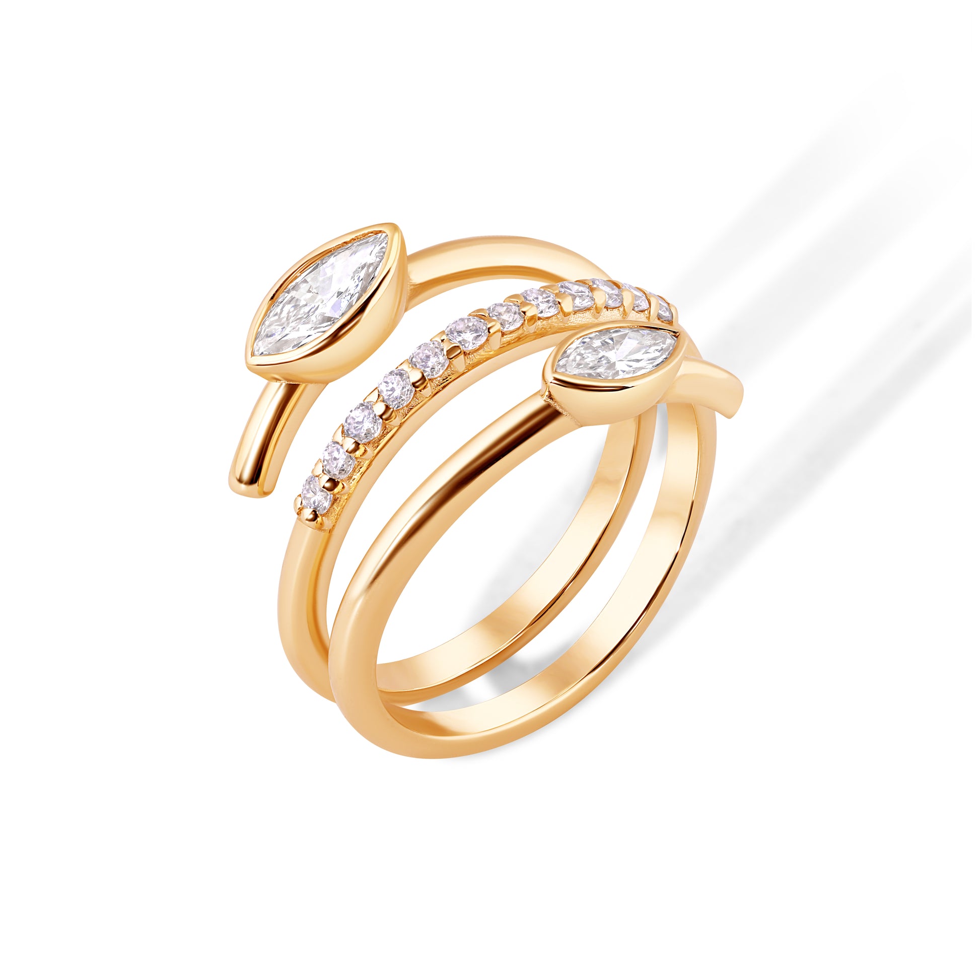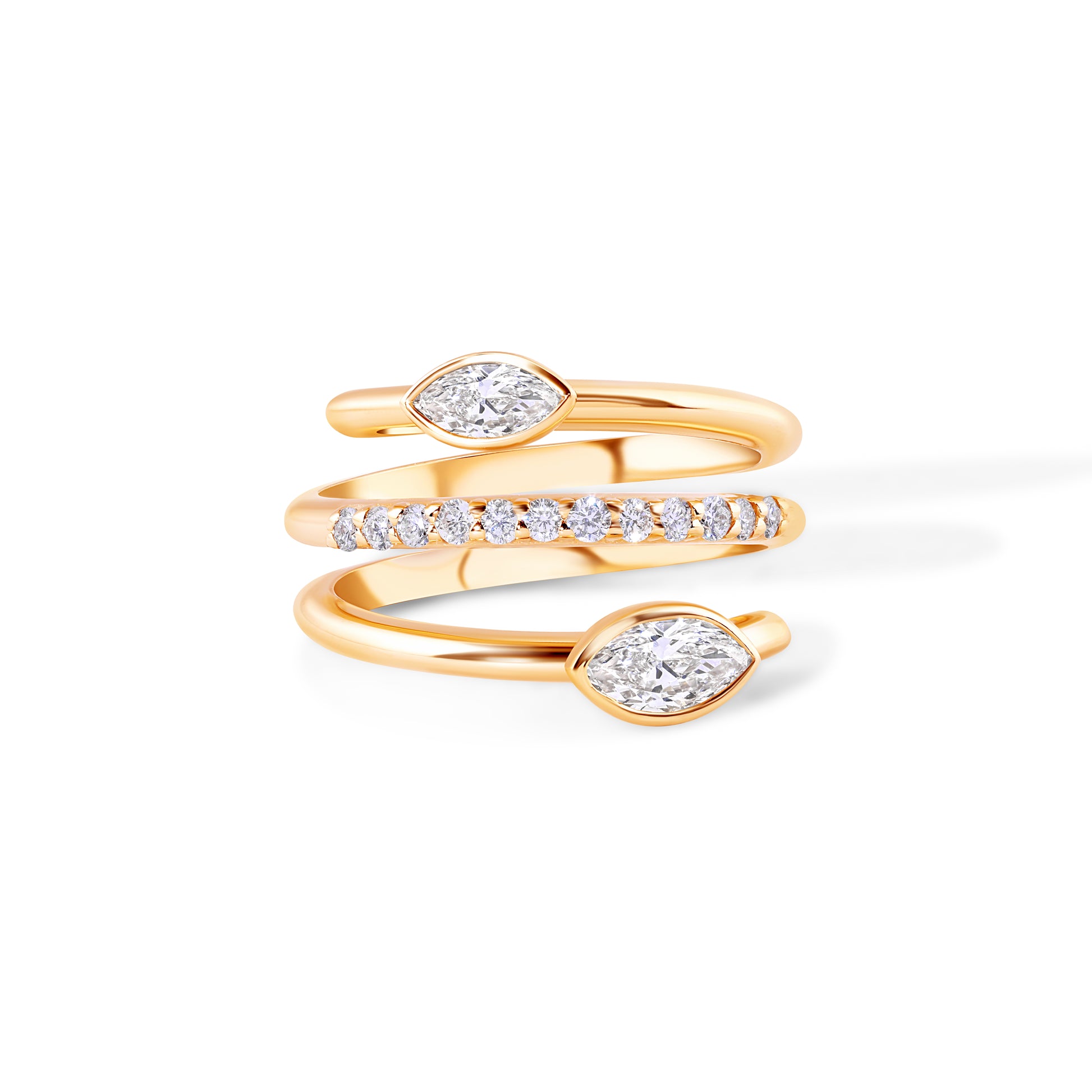 Where modern artistry meets timeless elegance. Carla is 14k gold wrap ring featuring two stunning marquise cut lab-grown diamonds gracefully set at each end of a triple band design, accented by a line of brilliant round lab-grown diamonds through the center. The sculptural silhouette creates movement and sparkle from every angle, a statement of refined sophistication and sustainable luxury.Ā