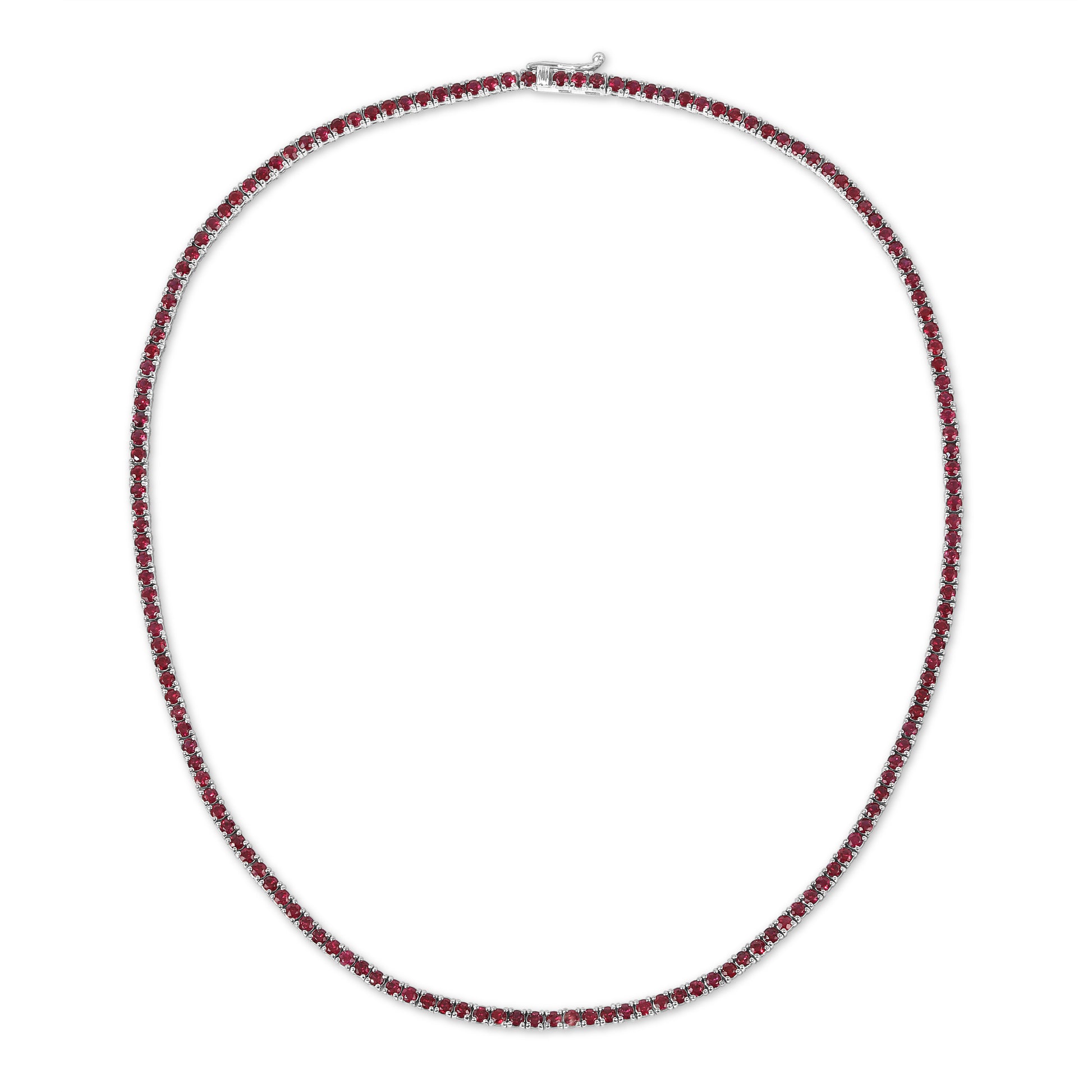 Our Dorothy ruby eternity necklace is a radiant expression of love and strength. Featuring a continuous line of vivid rubies, this necklace symbolizes unbroken elegance and enduring passion. Whether worn as a statement piece or layered for added allure, its deep red hue and classic design make it a striking addition to any jewelry collection.