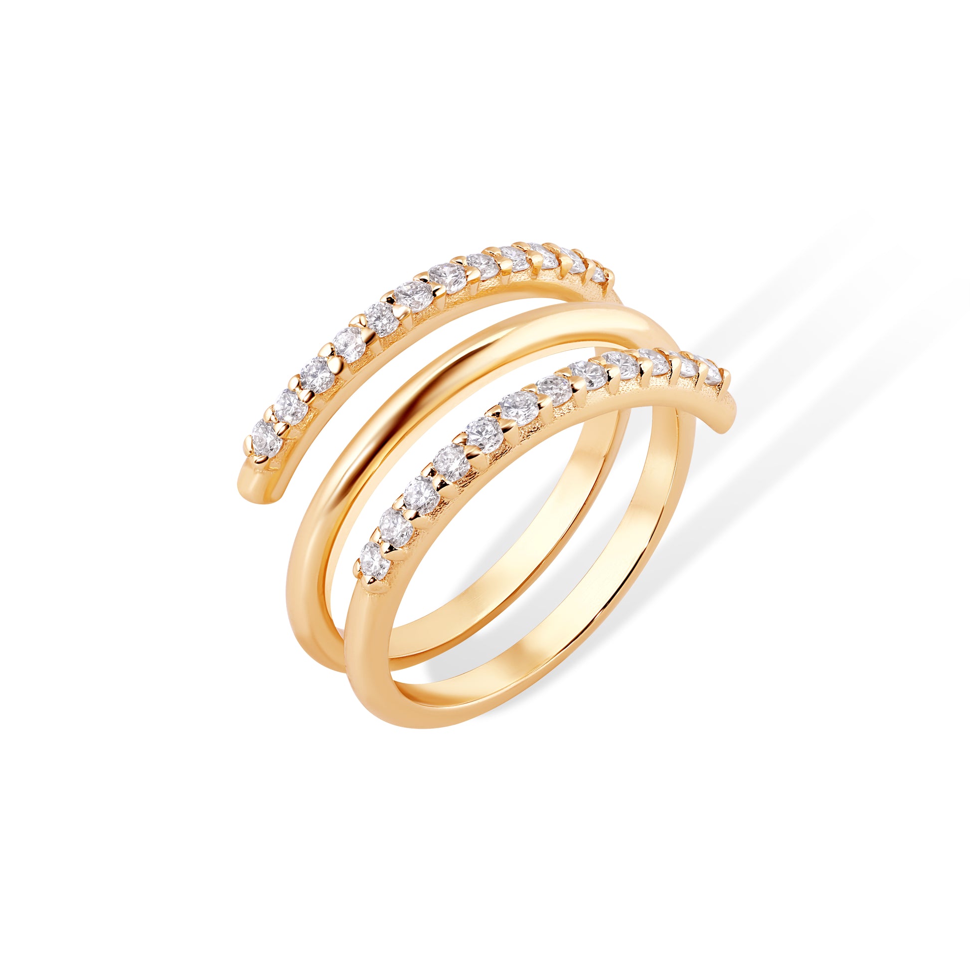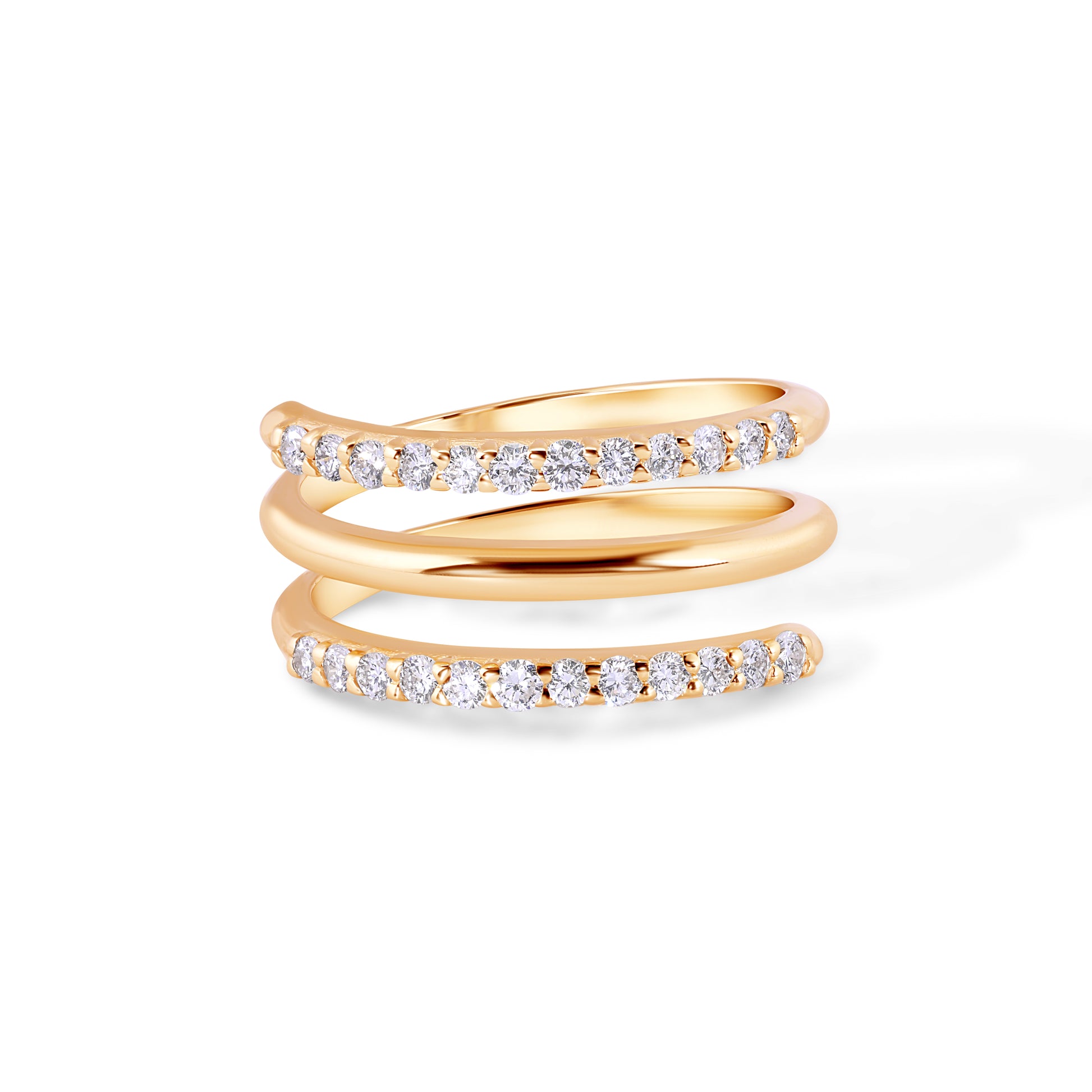 A modern expression of elegance and movement. This wrap ring features three sculpted 14k gold bands, two delicately lined with radiant lab-grown diamonds, creating a fluid, shimmering design that wraps gracefully around the finger. The open silhouette gives a contemporary edge while maintaining timeless sophistication.