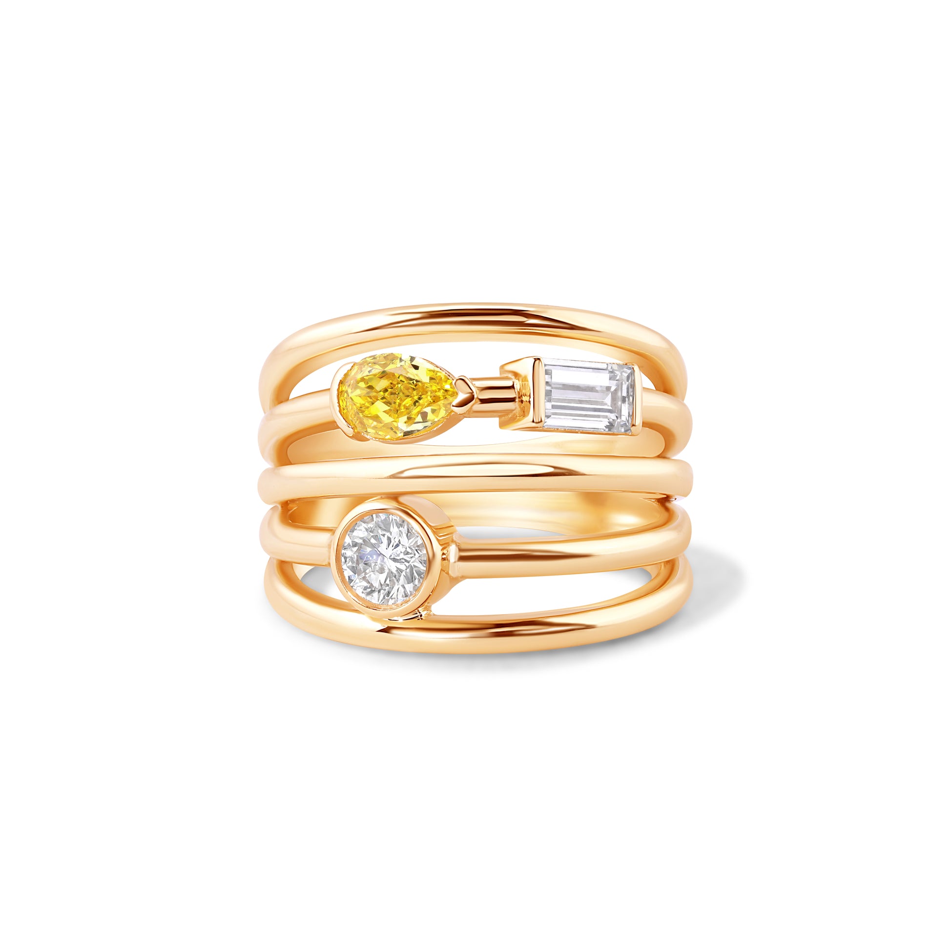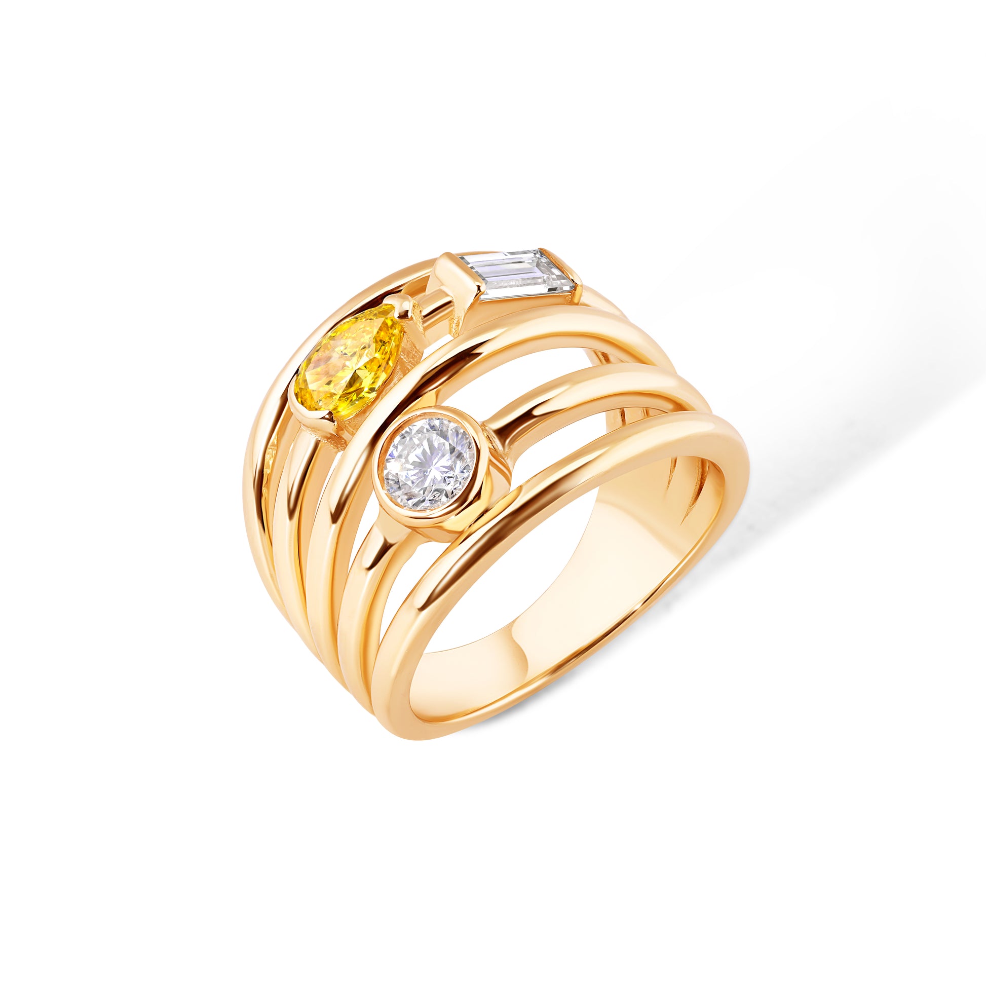 Bold, radiant, and full of character, the Melina ring captures light and movement from every angle. Crafted in 14k solid gold, this sculptural multi-band ring features a trio of lab-grown diamonds in striking cuts: a vivid yellow pear, a sleek baguette, and a classic round brilliant. Each stone is uniquely set to create a dynamic interplay of color and shape, symbolizing individuality and harmony.