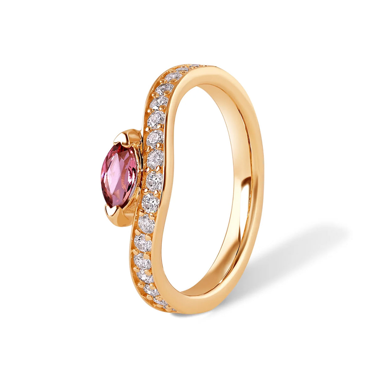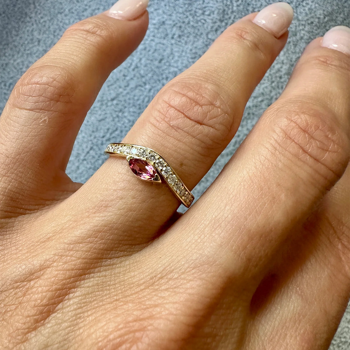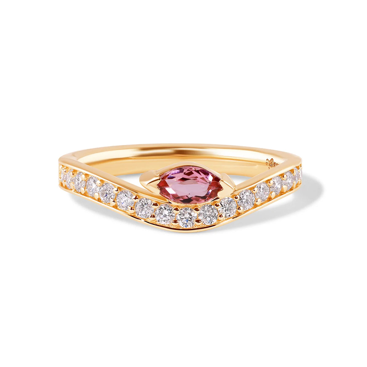 Delicate yet distinctive, our Sylvie ring a marquise-cut pink tourmaline ring is a modern take on timeless elegance. The vibrant pink tourmaline—cut in a graceful marquise shape—captures light beautifully, creating a striking focal point. Framed or accented by sparkling diamonds, this ring exudes a soft glamour that’s perfect for everyday wear or special moments. Designed to be worn as a pinky ring, its slim, refined silhouette offers a bold touch of personality and sophistication. A graceful expression of color, style, and individuality.